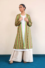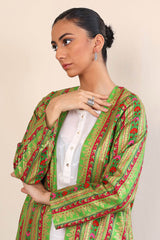 An iridescent printed long jacket, for outerwear with full sleeves.