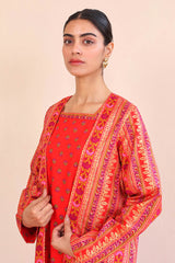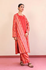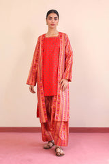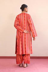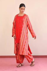 Iridescent printed short kurti with three quarter sleeves and square neckline, paired with a contrast print shalwar.