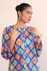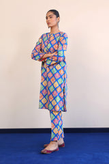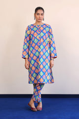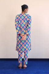 A printed long shirt with buttons on placket and drop shoulder sleeves. Paired with straight fit pants.