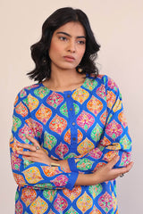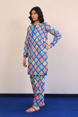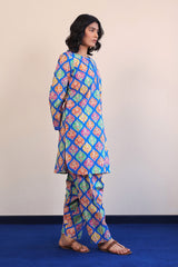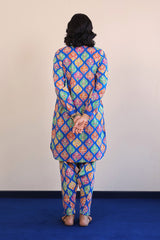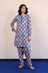 Printed multi-coloured kurta with cuff sleeves, and buttons on placket. Paired with classic fit shalwar.