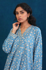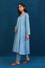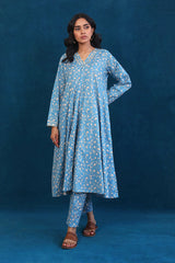 A long flary dress with V shaped neckline with gota lace details on neck and sleeves. Paired with straight fit trousers.