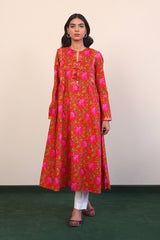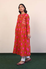 A long, printed band neckline with dip dress, with pleats on sides, and full sleeves.