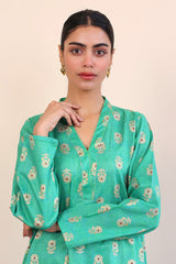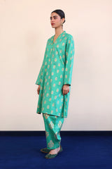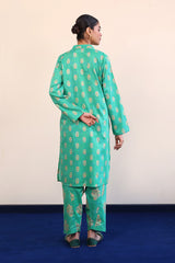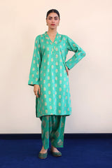 A long straight shirt with jaquard pattern all over, with band V shaped neckline, and full sleeves. Paired with a pattern shalwar.