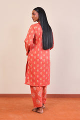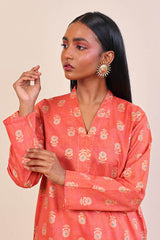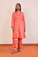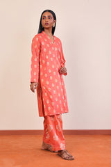 A long straight shirt with jaquard pattern all over, with band V shaped neckline, and full sleeves. Paired with a pattern shalwar.