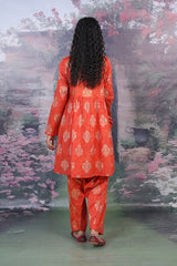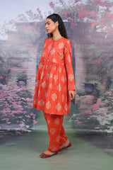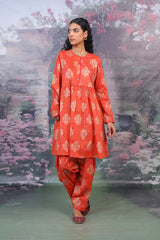 A pleated short frock with jaquard pattern and round neckline. Paired with a matching jaquard shalwar.