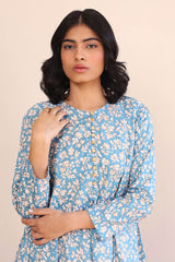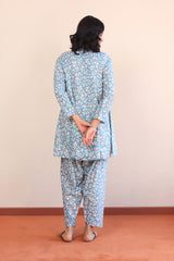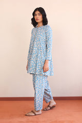 Printed flared shirt with button details on neckline, paired with printed classic fit shalwar.