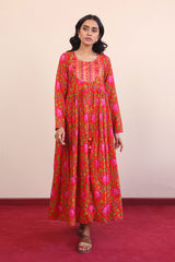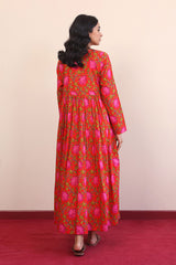 Print blocked flared printed dress with bib neckline, buttons and gathers on waist.