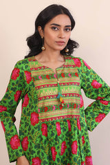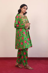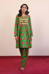 Print blocked flared shirt with tassels on neckline and gathers. Paired with classic fit printed shalwar.