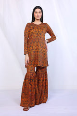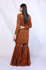 A short printed shirt with round neck and fabric buttons on front, paired with a matching voluminous gharara.