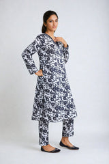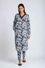 A long printed shirt with V shaped neckline with full sleeves and paired with straight trousers.