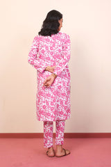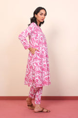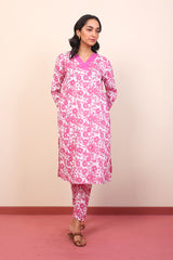 A printed long shirt with V shape neckline and thick piping detail on neckline, pockets and sides and paired with straight fit pants-Model is wearing size 8 and height is 5' 7''