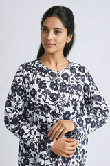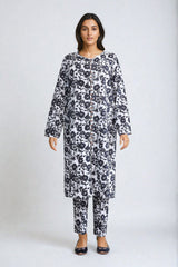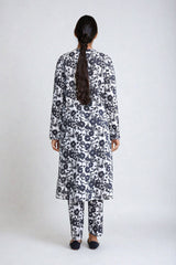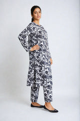 A printed long button down shirt with round neckline, paired with straight trousers.