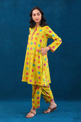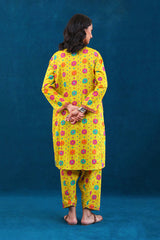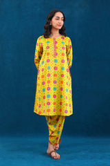 A printed peplum top with pockets, buttons on placket and full sleeves. Paired with a printed shalwar.