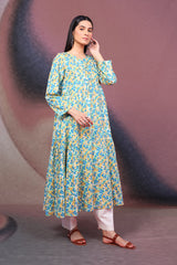 A printed tiered dress with round neckline and slit, and full sleeves.-Model is wearing size 8 and height is 5' 7''