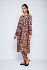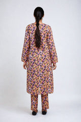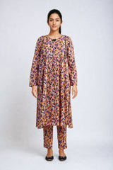 A printed shirt with flare details on front and piping details. Paired with straight trousers.