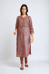 A long striped shirt with piping details on front, paired with straight trousers.