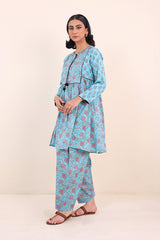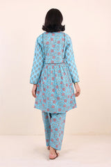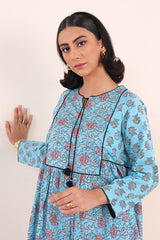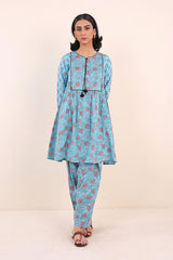 Print blocked flared shirt with gather details and dori tassel on neckline. Paired with classic fit printed shalwar.
