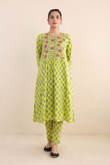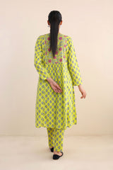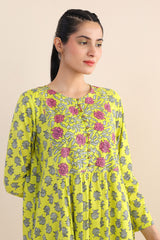 Print blocked shirt with gather details on waist and buttons on placket, paired with straight fit pants.