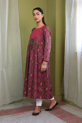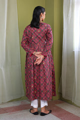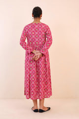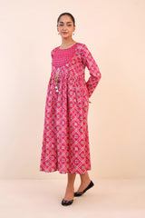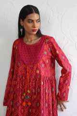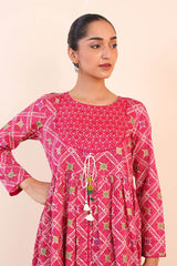 Printed blocked dress with gather details and dori tassel on neckline.