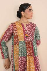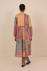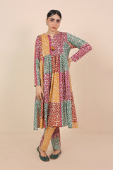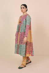 Printed flared shirt with gather details, adorned with tassel details. Paired with straight fit pants.
