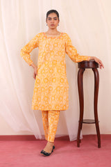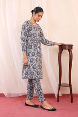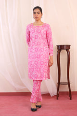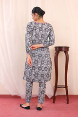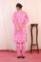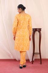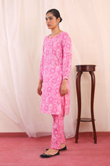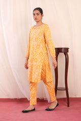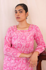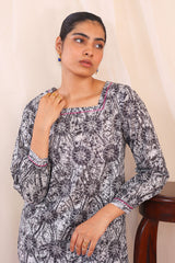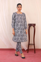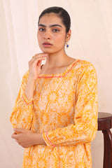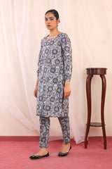 Printed kurta with square neckline and cuff sleeves. Adorned with hand stitch details on sleeves on neckline. Paired with straight fit pants.