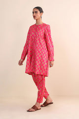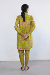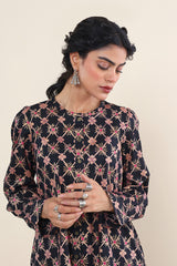 Printed, front open shirt with puff sleeves and buttons on placket.