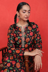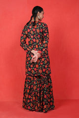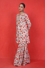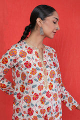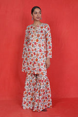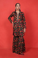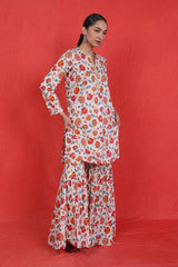 A printed short kurti with golden dory work detailing at neckline and buttons across the front, adding a touch of lux appeal to the kurti. Paired with flowy matching printed gharara pants.