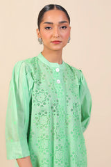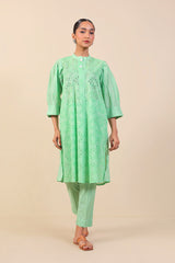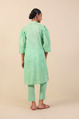 Custom designed schiffli patterned shirt with flared sleeves and buttons on placket, paired with staright fit pants.