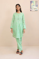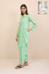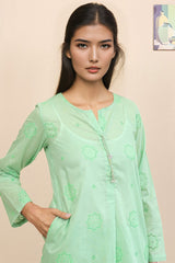 Custom designed shciffli shirt with buttons and tassel details on placket, paired with straight fit pants.