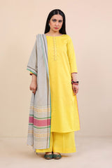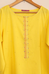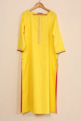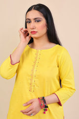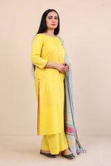 Microcheck straight kurta with mukaisha nd stitch details on neckline, paired with plain culottes and yarn dyed dupatta.