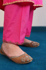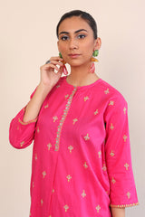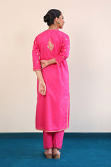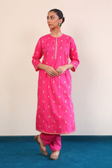 A long straight embroidered shirt with round neckline and full sleeves, paired with an embroidered shalwar