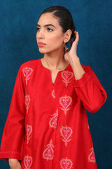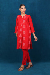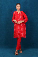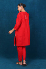 An embroidered loose fit shirt with pleats on front, round neck with slit, paired with straight trousers.