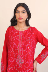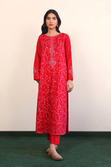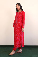 A long embroidered straight shirt with boat neckline, and full length fitted sleeves. Paired with churidaar trousers.