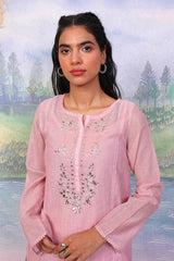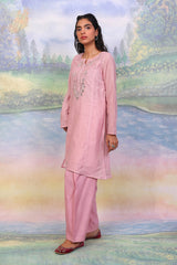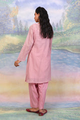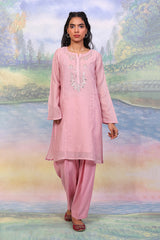 A cotton net panelled A-line shirt with duo toned mukaish adorned on neckline, with gota kingri lace on hems and sleeves. Paired with a matching shalwar. Comes with a slip.