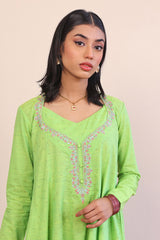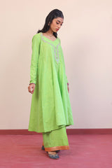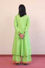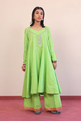 A long flared dress with embroidery on bodice and churidar sleeves, Paired with flared, wide culottes.