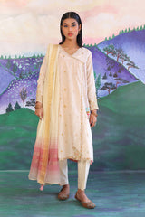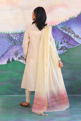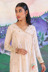 Angrakha style karandi suit with embroidery details & adorned with dori. Paired with straight fit pants. And cotton chanderi blend denier dupatta.