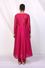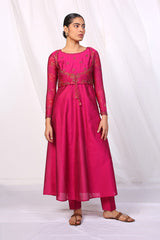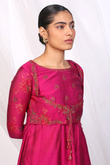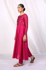 Cotton Chanderi blend anarkali with jacquard sleeves and embroidered bodice, paired with straight fit pants.