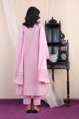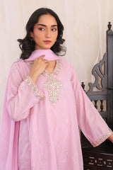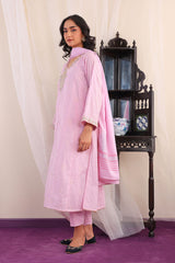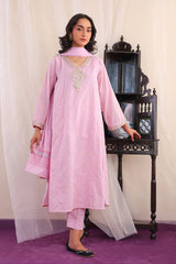 A-line embroidered kurta with gota patti work on neckline & sleeves. Paired with straight fit pants, an undershirt and denier striped dupatta.