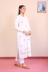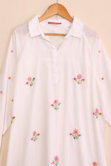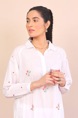 A micro check long collared shirt with hand embroidered floral arramgements adorned all over and cuffed full sleeves.