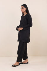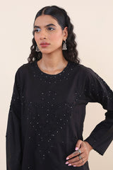 A handcrafted gem with intricate patti work and mukaish highlights on a solid base shirt, with round neckline. Pired with a shalwar.