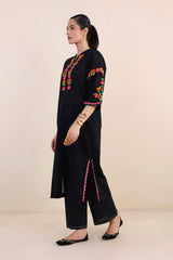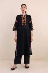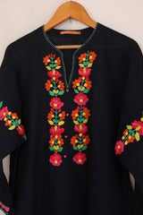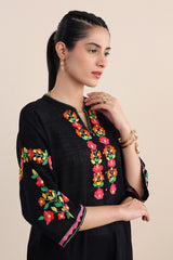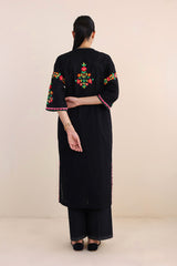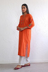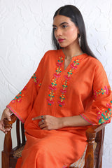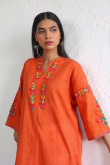 Hand embroidered rilli work boxy kurta with fish stitch details on neckline.