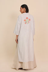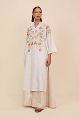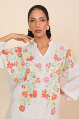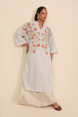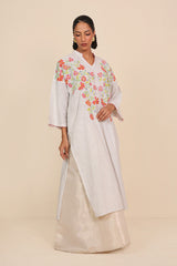 Hand embroidered dropped shoulder kurta with band necline, featuring Ralli with botanical applique details across bodice and back with colorful stitch details on neckline and sleeve hems.