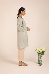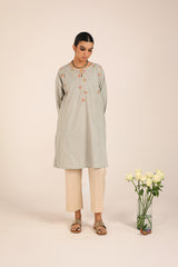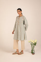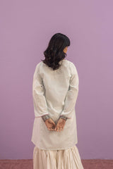 A classic fit, pastel-hued kurta featuring a round neckline with a delicate V-slit. The neckline and bodice are adorned with intricately handcrafted phool booti motifs, adding a touch of finesse. The sleeve hems are accentuated with delicate stitch detailing, making it a versatile piece that can be paired with any Gen fit.