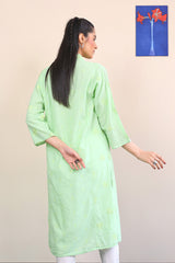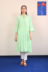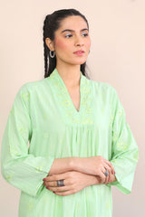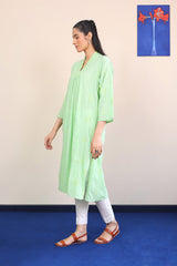 Long solid shirt center pleats, embroidery and mirror work all over, full sleeves and v neckline.