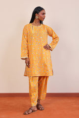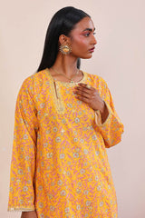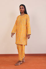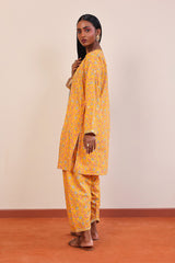 A printed co-ord set, with sequin work on neckline and loop cutout on shoulder. Paired with a sequined shalwar.