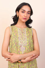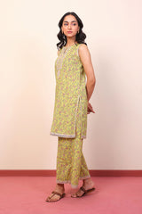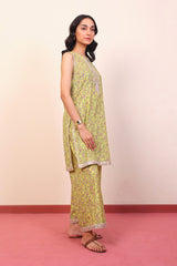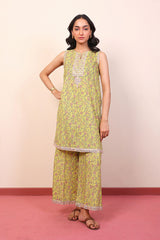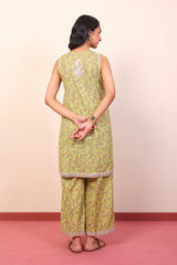 Printed sleeveless kurti with sequins & thread embroidery details, paired with loose fit printed culottes.