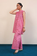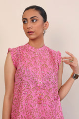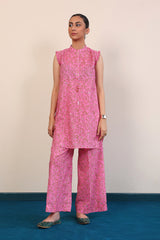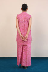 A sleeveless printed shirt with frills around armhole, band neck with hidden placket and tassels. Paired with printed culottes.