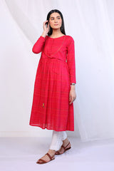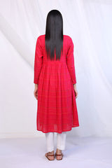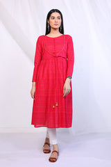 A long embroidered dress with an attached koti, blanket stitch details on koti and round neckline with tassels.