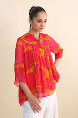 Bold & bright floral printed top with band collar and pleats detailing at the shoulders with gathers at the back.