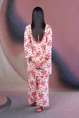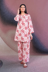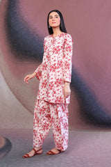Printed round neck shirt with beaded edging on neckline and sleeves with buttons on placket. Paired with a matching printed shalwar.